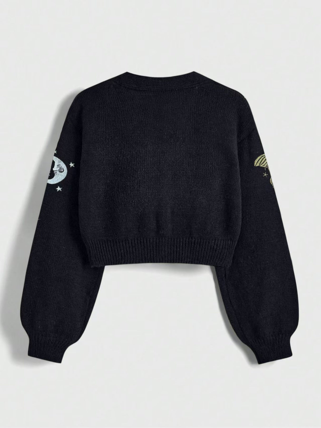 New Women's Embroidery Button Knitted Cardigan Sweater With Sun And Moon Pattern Lantern Sleeves V-neck Cardigan Top